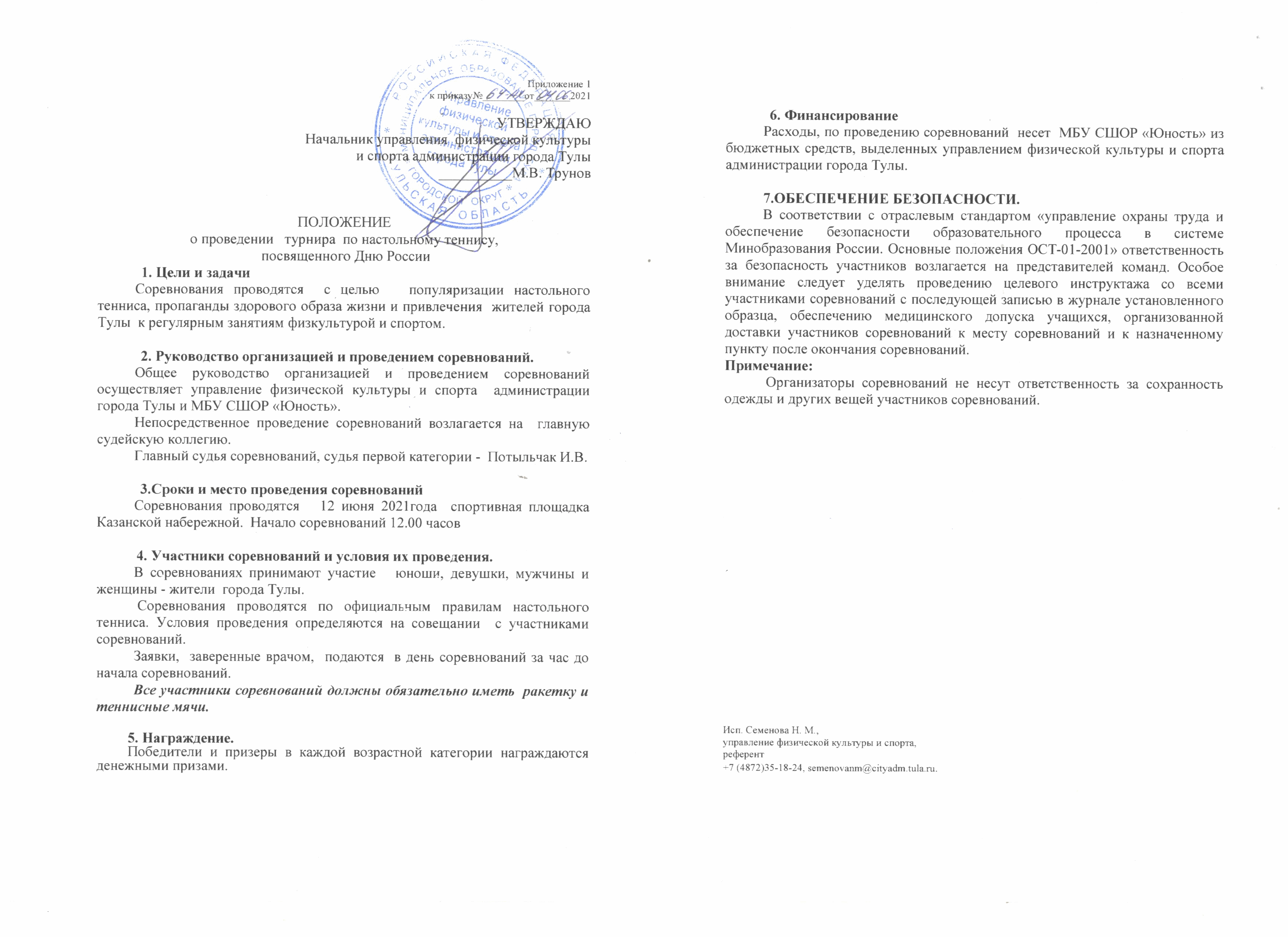Положение о проведении открытого чемпионата города Тулы по настольному теннису среди мужчин и женщин
